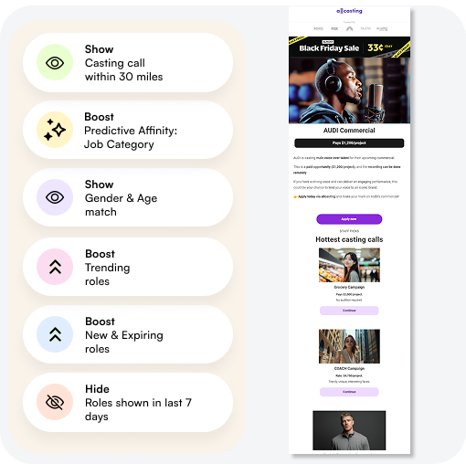Casting calls are often held in-person making location a crucial factor in what roles to serve to users in campaigns, along with the need to highlight jobs by popularity, new and expiring jobs, preferences.