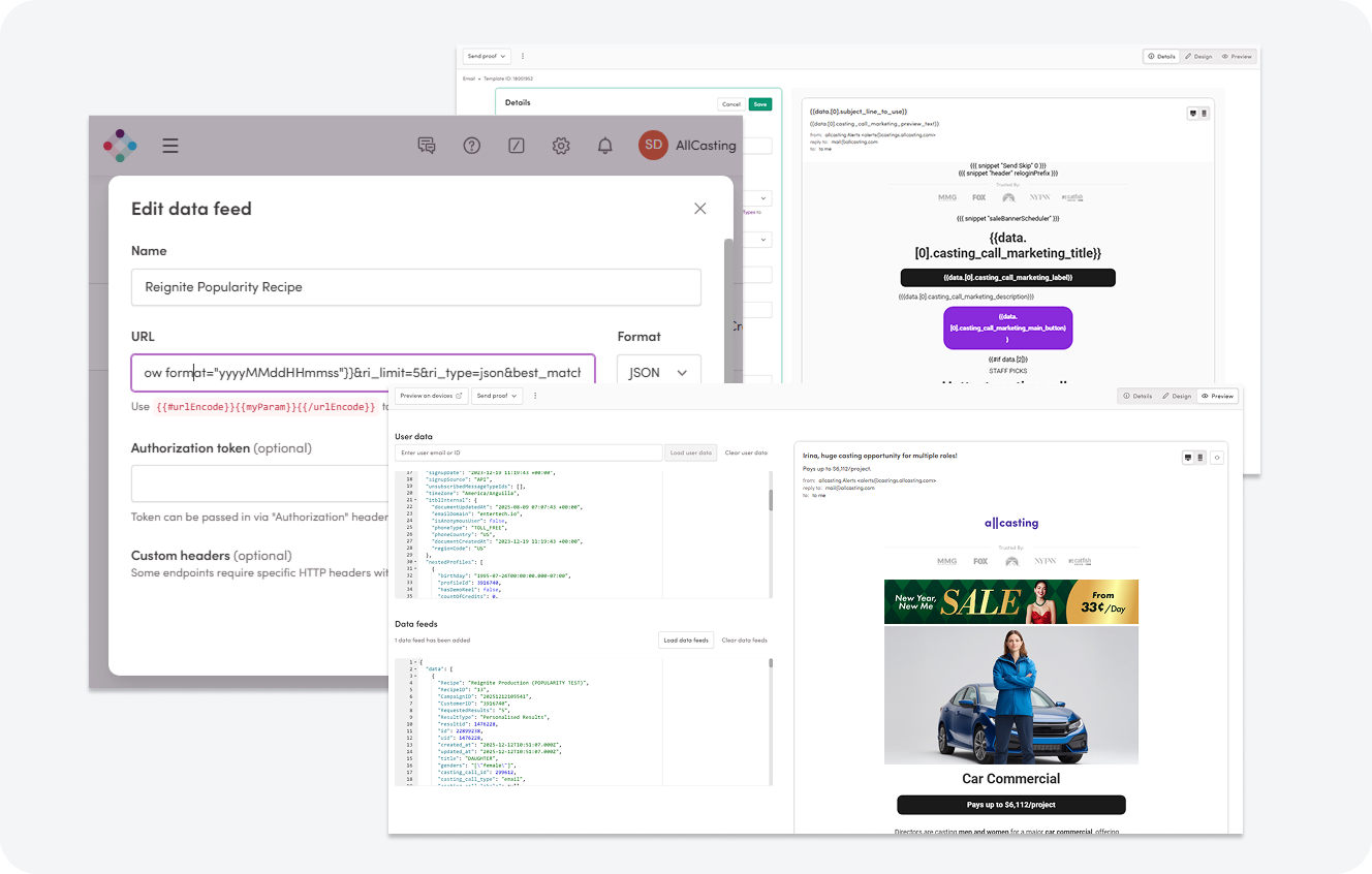 Each email has a lead recommendation which is also used to populate the subject line. Underneath a number of alternative secondary casting call recommendations are shown. Multiple subject lines are tested against each of these to find the one that drives the highest engagement.