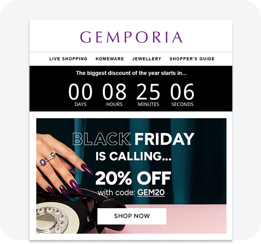 Gemporia create custom countdown timers to drive urgency across their promotions.